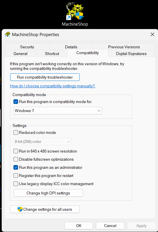 For using the product with Windows 11/10 we recommend the following settings after installation. Right click on the MachineShop icon and match the compatibility tab settings as in pic below. Interact MachineShop is not officially Win11 compliant, but these settings have worked on most systems.
